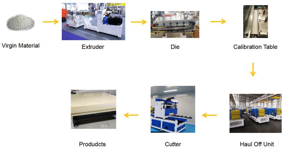 Exceptional engineering raw materials → Extruder plasticization → Mold → Setting → Cooling and traction → Cutting → Transportation → Finished product.